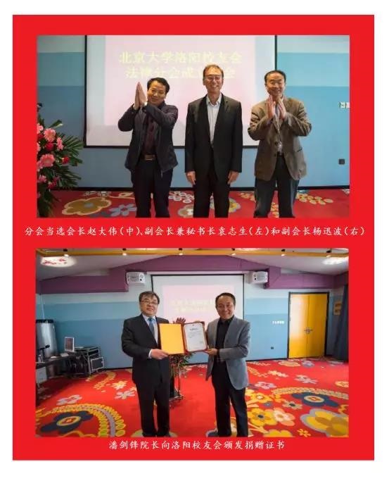 北京大學洛陽校友會常務理事趙大偉介紹法律分會籌備情況,會長郭引強宣讀北京大學洛陽校友會擬提議法律分會導機構人選,與會校友代表舉手表決,選舉趙大偉任法律分會會長,袁誌生任法律分會副會長兼秘書長,楊迅波任法律分會副會長。會上,北京大學法學院黨委副書記、校友會副會長路薑男致辭,從凝聚校友、服務校友、助力校友三個方麵介紹法學院校友工作情況及取得的成績。北京大學法學院院長、法學院校友會會長潘劍鋒發表講話,從北京大學師生規模及構成、教學、科研、際交流、硬件設施等方麵介紹了法學院近年來的主要工作和取得的喜人成績,與會校友備受鼓舞,十分振奮。潘劍鋒院長還向洛陽校友會頒發了贈送母校300株牡丹花的捐贈證書。